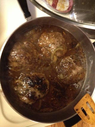Combine ground chuck, parsley, scallions, salt, and pepper. Divide evenly into four portions and shape each into 3/4 to 1-inch thick oval patties. Place 2 tbsp flour in a shallow dish; dredge each patty in flour. Reserve 1 tsp flour.