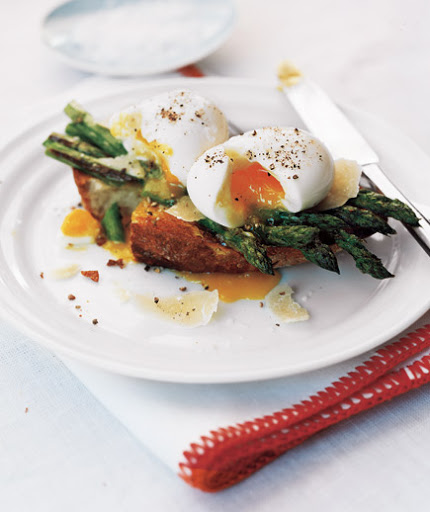 Divide the asparagus among the toast, sprinkle on the Parmesan, and top with the eggs.