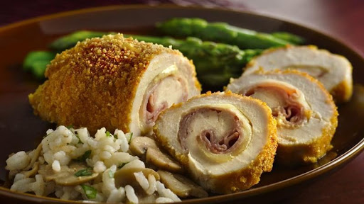 Spread each chicken breast with 1/2 teaspoon mustard; sprinkle with 1 teaspoon chives. Cut ham and cheese slices to fit chicken. Top each chicken breast with ham and cheese slice. Roll up, tucking ends inside.
