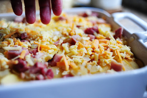 (Note: To speed along the process a bit, you may boil sliced potatoes for 3 to 5 minutes before assembling the casserole. Just drain and slightly cool before assembling.)