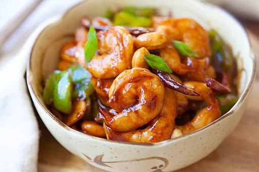 When the shrimp are almost cooked, add the Kung Pao sauce into the wok, keep stirring until the sauce thickens. Add the chopped scallions, do a few quick stirs, dish out and serve hot.