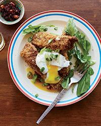 all the fat has rendered, about 10 minutes. Using a slotted spoon, transfer the bacon to a paper towel–lined plate. If necessary, add enough canola oil to the saucepan to make 3 tablespoons of fat. Add 3 tablespoons of the flour and whisk over moderately low heat until the mixture turns tawny brown, about 5 minutes. Whisk in the cream, milk, espresso and bacon and cook, whisking, until the gravy thickens, about 2 minutes. Season the red eye gravy with salt and pepper and keep warm.