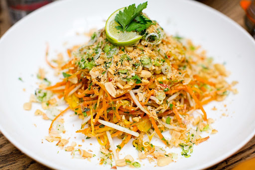 Peel the outside of the Mango and Carrots, then use a Julienne Peeler to prep both, (if your mango is too soft do this with a sharp knife instead). Add to the Bean Sprouts bowl.