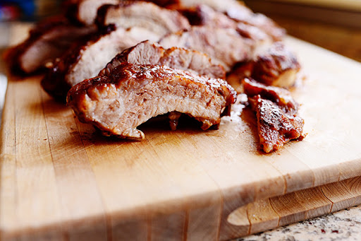 When you're ready to cook the ribs, preheat the oven to 275 degrees. Place the pan, still covered in foil, into the oven for 2 hours. Remove the foil and increase the temperature to 300. Using the other half of the sauce, brush another generous layer all over the ribs. Return the pan to the oven and continue cooking for another 30 to 40 minutes, brushing on another layer of sauce as it cooks.