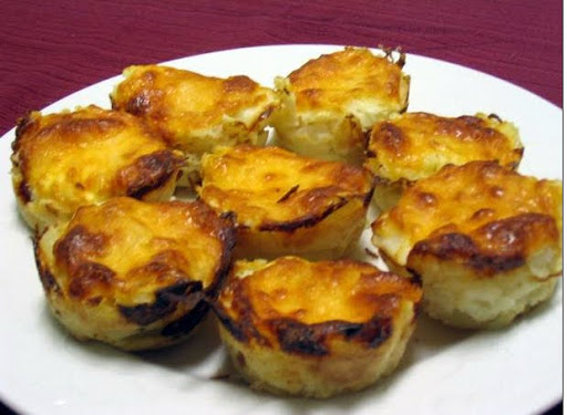 Arrange the potatoes in the tin/s holes in layers - seasoning every other layer or so with the crushed garlic, salt & pepper.