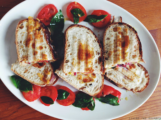 The panini sandwich may also be achieved by placing on a griddle with a heavy pan on top of it; grill until the cheese is melted; then flip and grill on the other side.