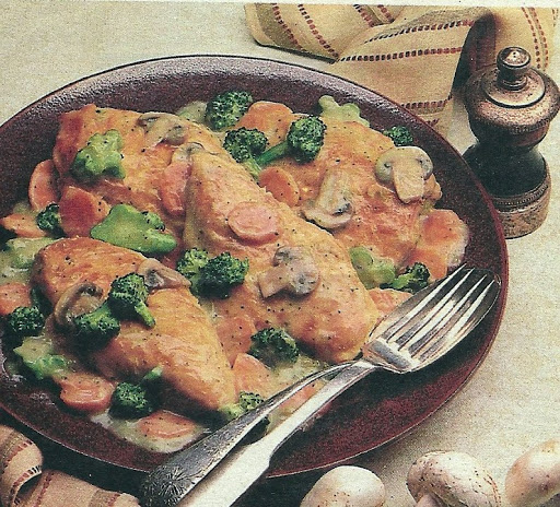 2. In same skillet, in remaining margarine, cook broccoli, carrots and mushrooms 5 min. stirring often. Stir in soup, milk and pepper. Heat to boiling.
