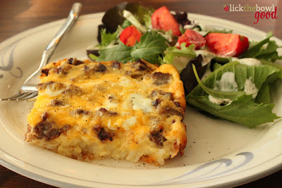 Sprinkle sausage and bacon in an even layer over the cooked potato crust then sprinkle the cheese on top to create even layers. Pour egg mixture over ingredients.