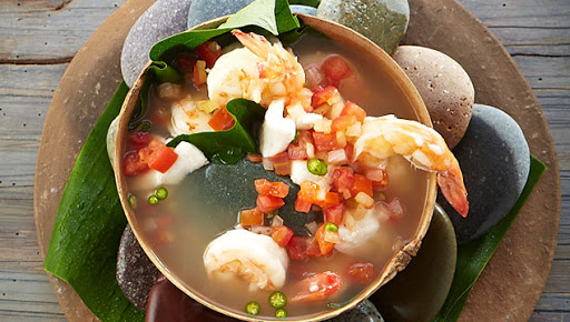 Coloca en un guaje o jicara, jícaras o tazones para sopa un pedazo de hoja santa y unas hojas de epazote y cilantro picado. Coloca encima huachinango, camarones, cebolla, jitomates picados, un poco de puré de tomate, el chalot y chiles. Aumenta el sabor con sal y pimienta.