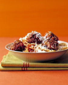 4.Meanwhile, in a large pot of boiling salted water, cook spaghetti according to package direction until al dente. Drain; return to pot. Toss with sauce; serve meatballs on top, sprinkled with more cheese.