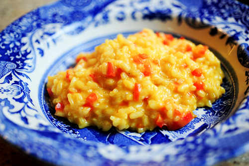 Bring broth to a simmer in a medium pan. In a large skillet or dutch oven, heat olive oil over medium to medium-low heat. Add diced onions and cook until translucent, about 1 to 2 minutes. Add red peppers and cook for 8 to 10 minutes. Add uncooked rice and stir for a minute or two, allowing it to be coated with the other ingredients.