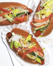 In a medium bowl, whisk together grainy mustard and white-wine vinegar; season with coarse salt and ground pepper. Add sweet onion, cucumber, tomato, celery leaves, and sport pepper; toss to combine.