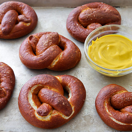 We use kosher salt on the exterior of our pretzels, but coarse pretzel salt may be substituted. However, be sure to still use kosher salt in the dough. Keep in mind that the dough needs to rise for 60 minutes, and then the shaped pretzels require a 20-minute rise before boiling and baking. These pretzels are best served warm, with mustard.