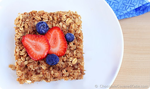 Baked oatmeal recipe: Grease a 9×13 rectangular pan and set aside. Preheat oven to 380F. In a very large mixing bowl, fully stir together all dry ingredients, then add all remaining ingredients. Transfer to the pan, smooth down with a spatula, and bake 28 minutes, broiling the final minute if desired. Then, keeping the oven door CLOSED, turn off the heat. Leave the pan in the closed oven for another 25 minutes. When the time is up, remove from the oven. Cut into bars or squares, and top with syrup or coconut butter or whatever you wish! Leftovers should be stored in the fridge, or freeze for up to a month. They freeze really well! I like to take one from the freezer and put it (covered) in the fridge the night before I want to eat it for breakfast.