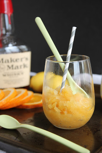 Add the orange juice concentrate, lemonade concentrate, tea mixture, and bourbon or rum to a large (2.5-quart) freezer-safe container. Whisk to combine. Cover tightly and freeze for several hours or overnight.