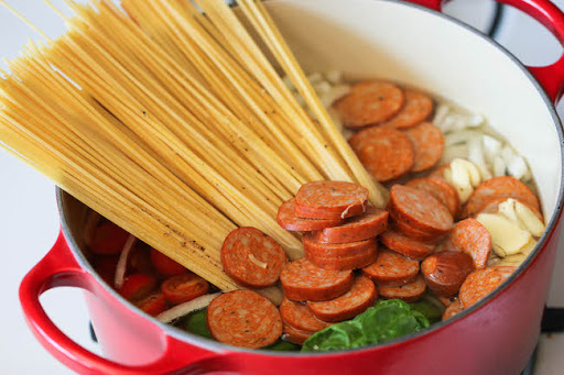 In a large stockpot or Dutch oven over medium high heat, combine spaghetti, sausage, onion, tomatoes, basil, garlic and 4 1/2 cups water; season with salt and pepper, to taste.