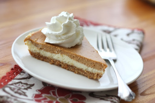 Pour 1/3 of this mixture over each pie crust. (This was approximately 1 1/3 cups of the filling.) Stir the pumpkin puree and the spices into the remaining filling and beat until well combined. Divide the pumpkin mixture between the two pies and use a spatula to smooth it across the cheesecake layer.