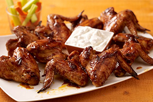 BAKE 35 to 40 min. or until wings are done, turning after 20 min. Brush with half the barbecue sauce mixture; bake 5 min., turning and brushing with remaining barbecue sauce mixture after 3 min.