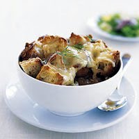 Toast bread slices (I use sliced baguette) until golden brown. Arrange these slices on top of the onion soup so they are floating. Sprinkle liberally with the cheese. Place under a preheated broiler or a preheated oven at 425.