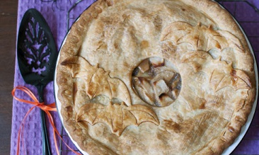 Unroll third piecrust. Using Halloween cookie cutters, cut several shapes to use as decorations. (You’ll have some piecrust dough left over.) Place on top of top crust.