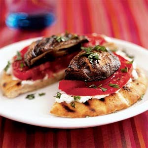 If the tomatoes are ripe, skip grilling them. Serve with a tropical fruit salad of mangoes, cantaloupe, and pineapple sprinkled with toasted coconut.