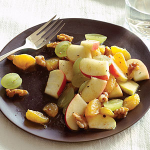 2. Core apples, cut into thin wedges, and cut wedges in half crosswise. In a salad bowl, combine remaining ingredients. Pour dressing over fruit and nuts and mix gently to coat.