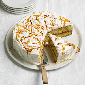 Spread Whipped Cream Frosting over top and sides of cake. Remove waxed paper pieces from under the cake. Just before serving, if desired, drizzle with Caramelized Sugar Drizzle. Serve with any remaining Dulce de Leche Cream.