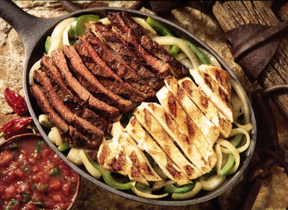 Para preparar las fajitas, retire la grasa de la carne. Combine 1 ½ tazas de adobo con la carne y el pollo en una bolsa de plástico grande con cierre. Selle la bolsa y deje marinar en la nevera 4 horas o toda la noche, volteando ocasionalmente. Combine la marinada restante con los pimientos y la cebolla en otra bolsa.