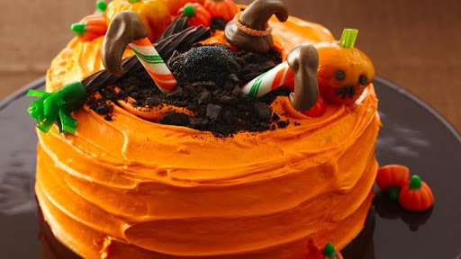 Fold remaining fruit snack in half lengthwise with paring knife; cut small slits into fruit snack without cutting all the way through. Wrap fruit snack around one end of chocolate licorice stick to make broom; place on cake. Decorate with candy pumpkins. Store loosely covered.