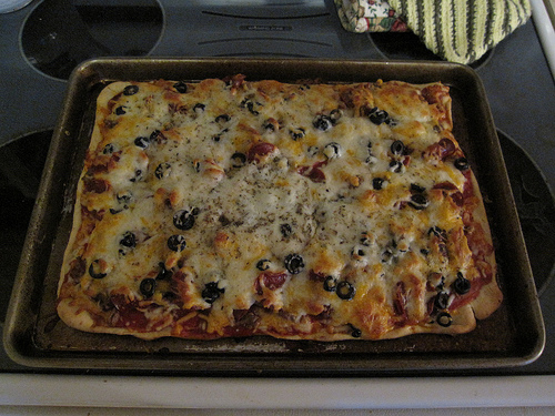 1. Preheat oven to 425 F. Sprinkle a healthy dose of flour all over it pizza stone, then spread the dough over the pan.
