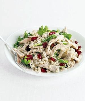 This delicious salad comes together quickly using leftover turkey. You could serve as a side salad but it's really a full meal all on its own - made with barley, shredded turkey, arugula, dried cranberries and a little olive oil with lemon juice.