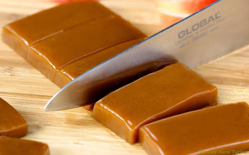 6. Cool completely at room temperature or refrigerate until set. Once set, remove caramel from pan lifting out by parchment paper or foil. Cut caramel into 3/4-inch squares or rectangles. Wrap each piece in small wax paper square, if desired, twisting at each end. Store caramels in airtight container in cool place or refrigerate up to 2 weeks.