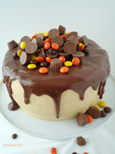 Fill and frost cake with peanut butter frosting. Chill in refrigerator while making ganache.