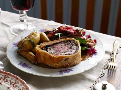Place the Beef Wellingtons in the center of 4 large plates, and accompany with the sauce and vegetables of choice.