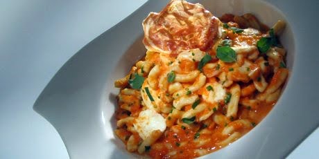 4. Pour the sauce over cooked pasta. Add the cheese and herbs and toss to combine. Serve with pancetta crisps.