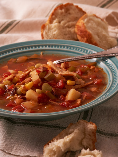 Add the chicken broth, tomato sauce, diced tomatoes, potatoes, chicken, corn, lima beans, Worcestershire sauce, barbeque sauce, hot sauce, salt, and pepper. Bring the stew to a simmer and cook until the potatoes are tender, about 30–35 minutes.
