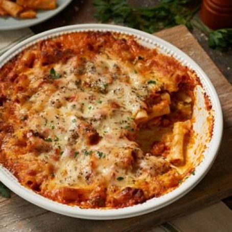 Add the cheese sauce, ziti, bacon, sausage, pepperoni, and pizza sauce. Stir until all the ingredients are combined. Place the mixture into a 2–1/2 to 3-qt casserole dish and top with Mozzarella and oregano.