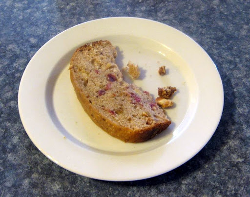 Very moist and a nice balance of flavor with this quick bread. The photo depicts what I found on the counter this morning. Evidently Red really liked the bread too!