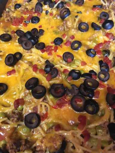 Have yor meat dealer grind the beef and salt pork together. Melt the butter in large skillet and in it cook the onion until lightly browned; add the meat and cook. stirring frequently,until well browned. Cook the spaghetti; in boiling salted water until tender; drain; add to the meat. Add the tomatoes and peas, half the pimientos and olives, and half the grated cheese; mix all the ingredients lightly together with fork. Pour into greased baking dish; sprinkle the remaining cheese, olives, and pimientos over the top. Bake in hot oven (400F.) for about 20 minutes or until the cheese is melted.