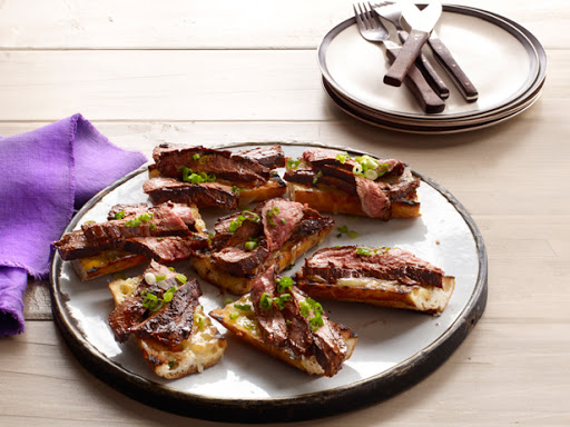 Thinly slice the steak against the grain. Arrange the steak slices on the bread and garnish with sliced scallions.