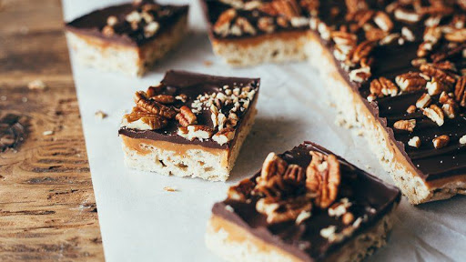 In double boiler over medium heat or in microwavable bowl in microwave, melt chocolate chips. If using microwave, microwave uncovered on High in 30-second increments, stirring after each, until melted. Pour melted chocolate over caramel; spread evenly. Sprinkle with pecans. Refrigerate until set, 1 to 2 hours. Cut into bars.