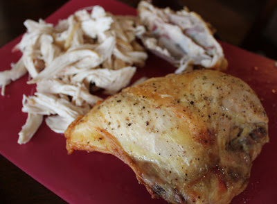 Place desired number of chicken breasts (MUST be bone-in, skin-on) on rimmed baking sheet. Rub all over with olive oil and sprinkle liberally with salt (I used kosher) and pepper. Roast for 35-40 minutes or until cooked through. Set baking sheet aside on rack to cool. Once chicken is cool enough to handle, pull meat from bones and skin, keeping just the meat. Use in any dish calling for pre-cooked chicken or eat by itself!