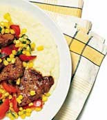 Add the corn to the bell pepper mixture and cook for 1 minute. Return the pork and any juices to the skillet and cook, stirring, until heated through, about 1 minute. Stir in the sliced scallions. Serve with the polenta.