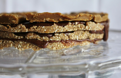 Assemble the thing: on parchment paper, press about 1/3 of the cake mixture into a thin circle layer with your hands. You can use a pan to help you shape it or draw a circle and use that to guide you. Transfer this carefully onto your presentation plate. Spread on 1/3 of the frosting evenly. Make another layer on the parchment paper and transfer it onto the first layers of cake and frosting. Continue until you run out. Cut the maca circle into eight slices and place on top of your cake. THEN EAT IT.