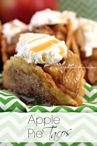 7.(see note below for serving suggestions) Fill each taco shell with about 2 tablespoons of pie filling (will vary based on shell size) and top with frozen whipped topping and a drizzle of caramel sauce if desired.