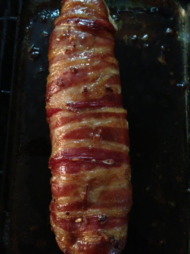 Wrap the tenderloin in bacon, with the ends of the bacon slices on the bottom. Place in a casserole pan. Poke holes in the meat with a fork.