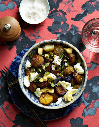 In a large bowl, toss roasted potatoes with brown butter, lemon juice and scallions. Season with extra salt and pepper to taste. Scatter crumbled egg over potatoes and serve immediately.