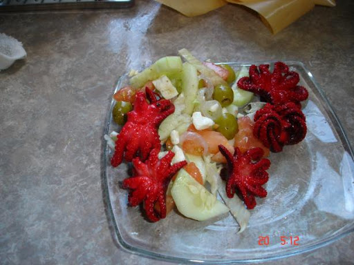9. Place octopus in a bowl with a tight fitting lid. Refrigerate. They are best served cold.