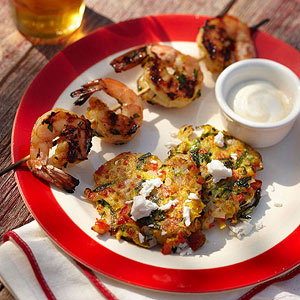 6. To serve, place two fritters and a shrimp skewer on each of two serving plates. If desired, sprinkle feta cheese over fritters. Serve with Dipping Sauce.