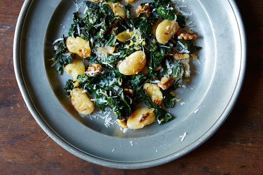 Add the kale and salt to the pan and cook for less than a minute, just long enough for the kale to lose a bit of its structure. Stir in the walnuts and garlic, wait 10 seconds, then stir in the nutmeg. Wait ten seconds and stir in the lemon juice and zest. Remove from heat and serve dusted with Parmesan cheese.